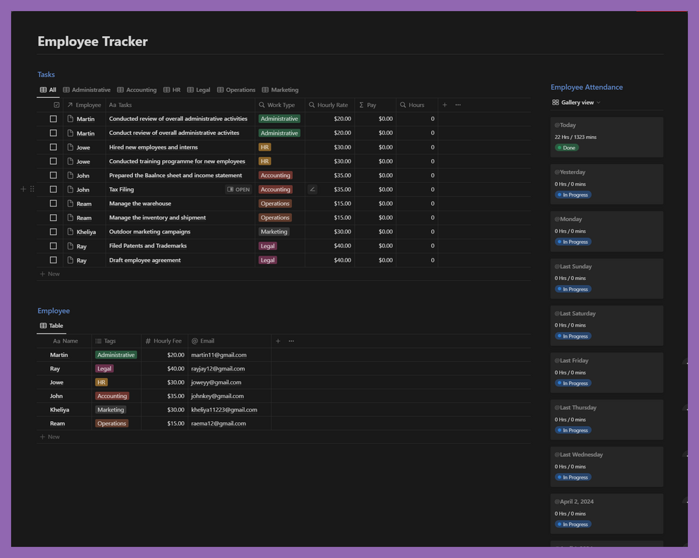 Employees tracker is a simple Notion Template that let's you manage your employees hours, tasks and resources [details] in a compact organized manner.