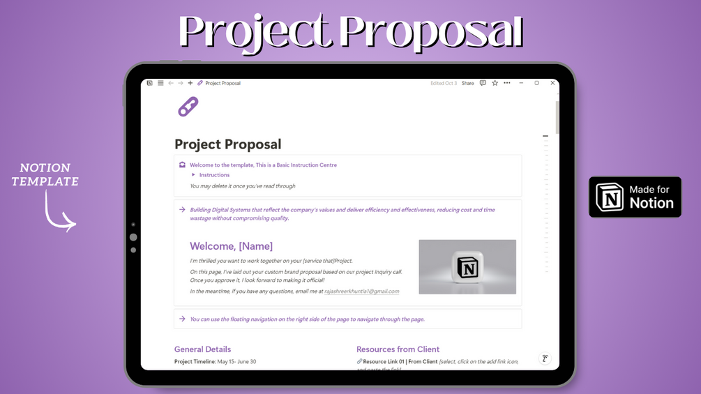 "Use this project proposal template to craft compelling, professional proposals with your brand identity, seamlessly within Notion."